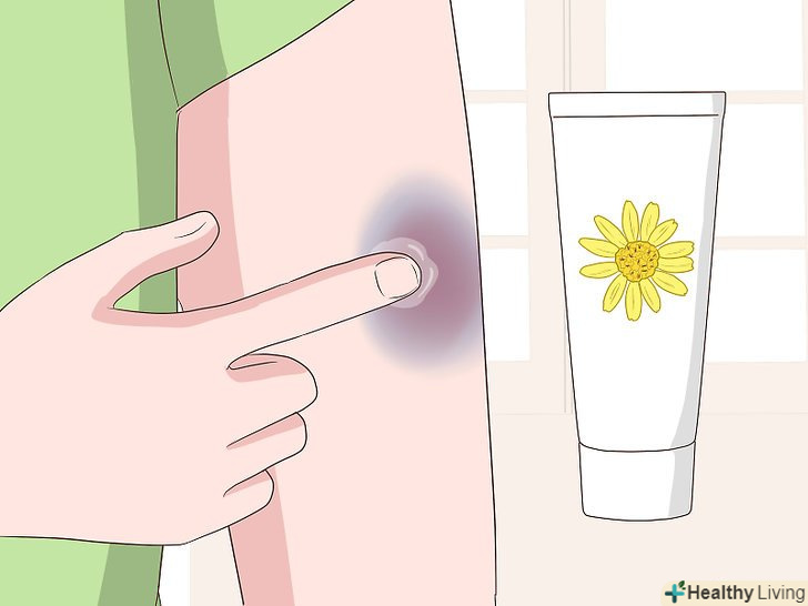 Наносите щодня мазь або гель з арнікою.арніка - це рослина, яка знімає запалення і може швидко зменшити розміри синяка. Крем або гель з арнікою можна купити в більшості аптек. Нанесіть крем на синяк двічі на день, поки синяк не зникне.[3]
