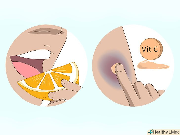 Наносите зовнішньо і вживайте всередину вітамін С. для швидкого загоєння синяка використовуйте двосторонній підхід до прийому вітаміну С.- Перш за все переконайтеся, що Ви отримуєте достатньо вітаміну С з їжею. Він міститься, наприклад, в апельсинах, манго, брокколі, перці і солодкій картоплі. Щоб отримувати необхідну денну норму вітаміну C, можете також приймати його у вигляді добавок.