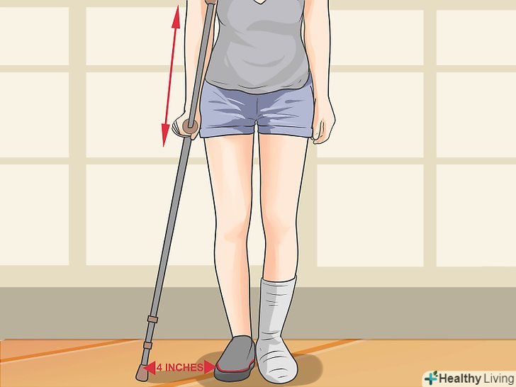 Навчіться правильно ставити милицю.як тільки милиця буде правильно налаштований (або підібраний) і встановлений зі здорового боку, упріть його нижній кінець в підлогу на відстані 7,5-10 см (в сторону) від серединної точки зовнішнього краю стопи, щоб забезпечити собі стійкість. Якщо не вся, то велика частина вашої ваги повинна підтримуватися випрямленою рукою з милицею, так як надмірне навантаження на пахву може привести до виникнення больових відчуттів і можливого защемлення нерва.[3]- На опорній перекладині і рукоятці милиці повинні бути присутніми м'які накладки. Ці накладки забезпечать більш надійне захоплення милиці, а також в деякій мірі будуть служити амортизаторами під час ходіння.