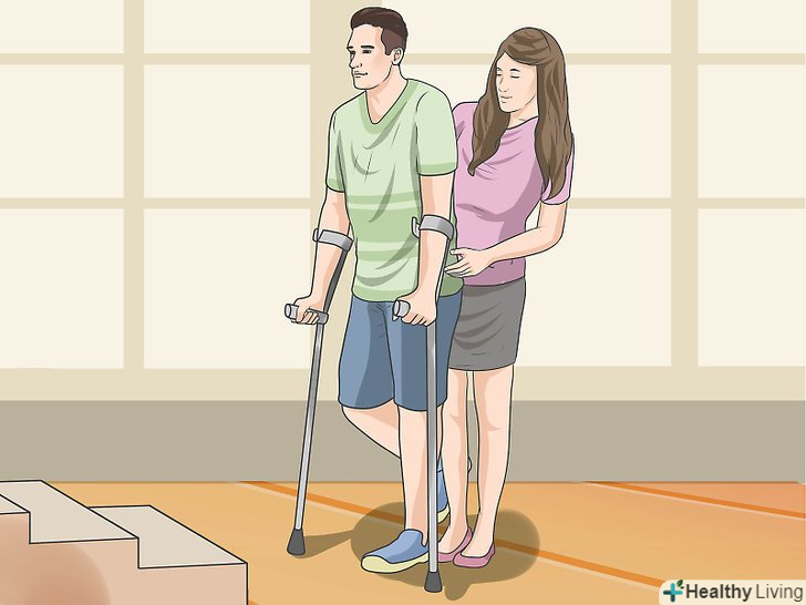 Підготуйтеся до того, щоб зробити крок.при підготовці до ходьби вам необхідно винести милицю вперед приблизно на 60 см і одночасно зробити крок вперед травмованою ногою.[4] потім винесіть вперед повз милицю свою здорову ногу, міцно утримуючи милицю витягнутою рукою за рукоятку.[5] щоб рухатися вперед, продовжуйте повторювати вищевказані дії: крокуйте милицею і травмованою ногою, а потім проносите вперед повз милицю здорову ногу..- Не забувайте підтримувати рівновагу, перекладаючи більшу частину своєї ваги на милицю, коли крокуєте травмованою ногою.