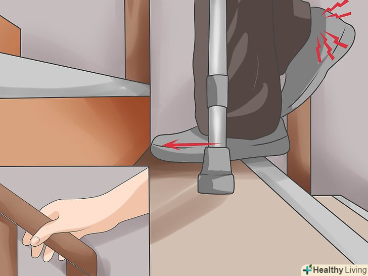 Дотримуйтесь особливої обережності при спуску вниз по сходах.Спуск зі сходів на двох або одному милиці потенційно небезпечніше підйому вгору через ту висоту, з якої Ви можете впасти, якщо випадково втратите рівновагу. Суть спуску полягає в тому, щоб міцно схопитися за перила і насамперед зробити крок на розташовану нижче сходинку травмованою ногою, а слідом спустити милицю з боку здорового боку і здорову ногу. Однак, не піддавайте хвору ногу занадто сильному навантаженні, так як через різку спалаху болю ви можете відчути нудоту або запаморочення. Завжди стежте за рівновагою і не поспішайте. Повторюйте вищевказані дії, спочатку крокуючи травмованою ногою, потім здоровою і так до самої основи сходів.- Запам'ятайте, що черговість кроків для спуску вниз по сходахпротилежна їх черговості при підйомі.