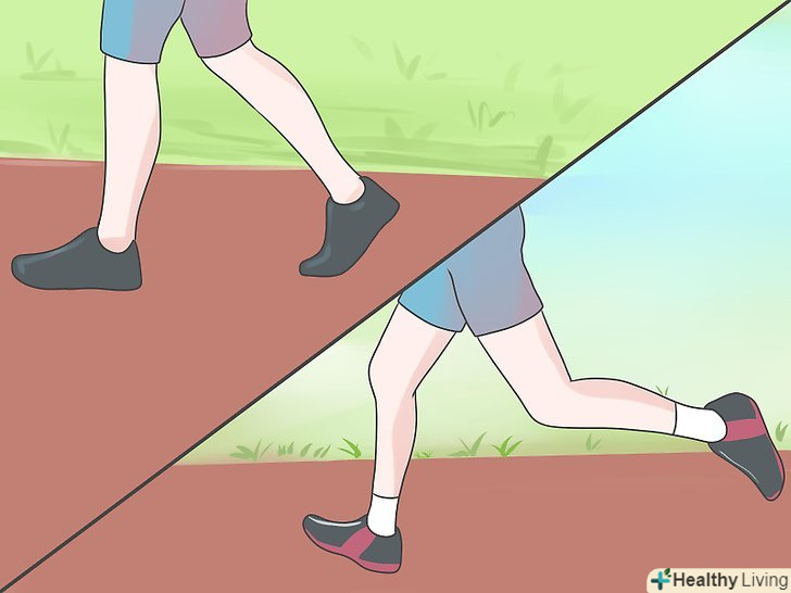 Почніть з ходьби і перейдіть в біг.почніть з ходьби, щоб переконатися в силі ваших ніг і в тому, що це не викличе нападів болю, а потім перейдіть до бігу підтюпцем кілька хвилин і поступово перейдіть до звичайного бігу.- Спершу походіть кілька днів, потім кілька днів побігайте підтюпцем, і в підсумку перейдіть до коротких пробіжок, поки не відновите свій попередній тренувальний режим.