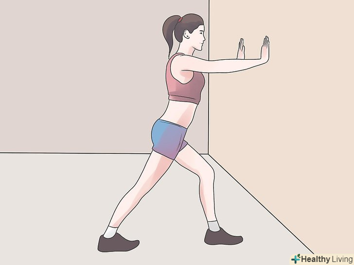 - Упріться руками в стіну і почніть згинати передню ногу. Ви повинні відчути напругу в литкових м'язах задньої ноги. Постійте так 30 секунд.