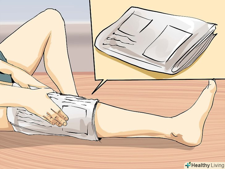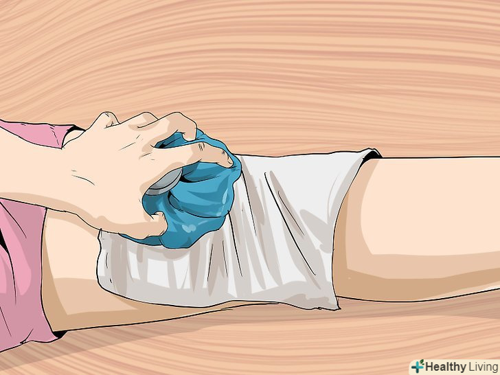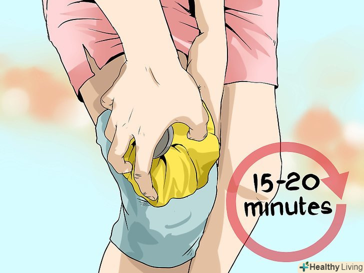 Прикладіть до коліна лід.після того як знерухомити коліно, прикладіть лід. Це дозволить знизити больові відчуття і зменшити набряк, викликаний внутрішньою кровотечею і скупченням рідини навколо травмованого суглоба.[12]- Щоб не обморозити ногу, не прикладайте лід прямо до шкіри. Обмотайте коліно тканиною або рушником.