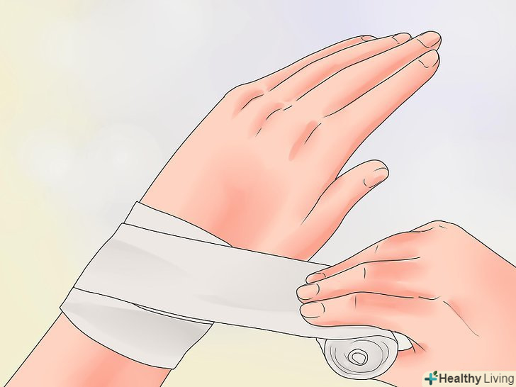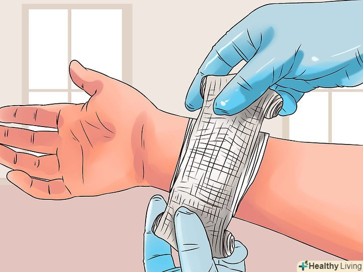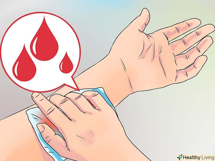 Стисніть рану для зупинки кровотечі.коли рана буде очищена, притисніть до неї на 15 хвилин чисту тканинну або марлеву серветку. Також уповільнити кровотечу можна підняттям травмованого місця вище рівня розташування серця.- Якщо поріз продовжує кровоточити і після цього, то вам слід викликати швидку допомогу.[9]