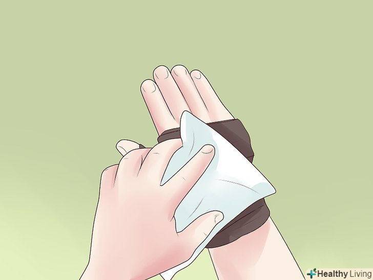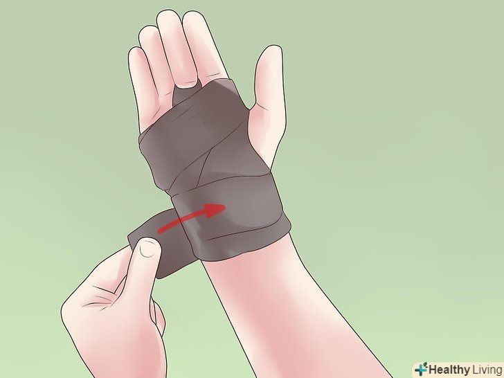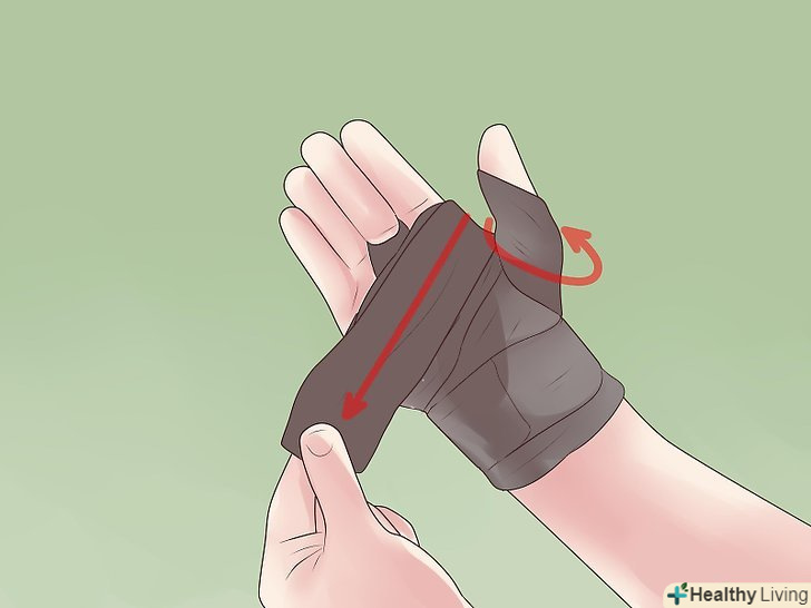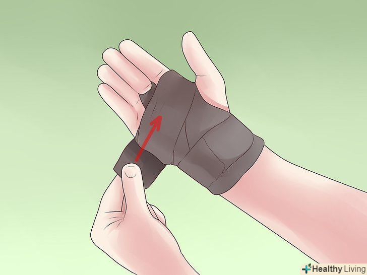 Приготуйте все необхідне і утримуйте травмовану руку долонею вгору.вам знадобиться липка, нееластична спортивна стрічка (яку можна придбати в аптеці) і ножиці. Помістіть кінець стрічки перед зап'ястям за допомогою не домінуючої руки. Потім оберніть тильну сторону долоні і мізинець іншим кінцем стрічки. Потягніть стрічку на палець, використовуючи домінуючу руку.[1]