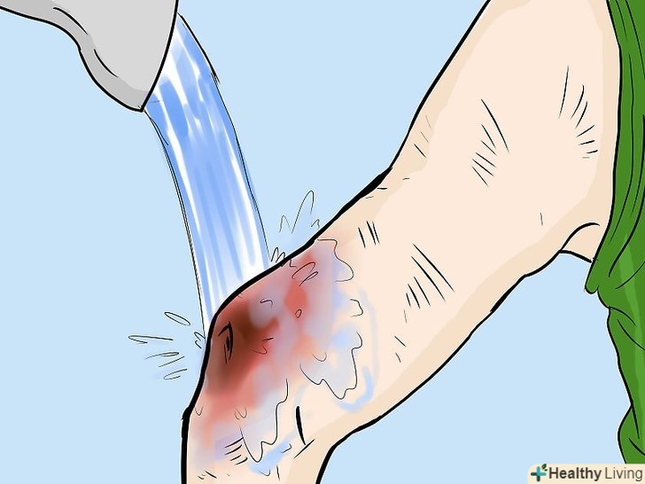 Обережно промийте травмовану ділянку теплою водою.це буде боляче, але дуже важливим є можливість вимити весь бруд і сміття з рани.[1]- Якщо частинки бруду залишилися в рані, стерилізують пінцет спиртом і витягніть при його допомозі знаходиться там гравій, скло йди інші частинки.