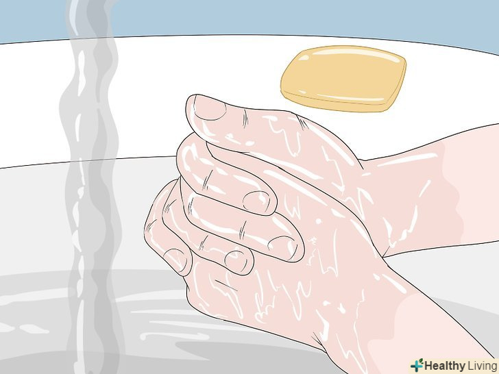 Мийте рукиПеред перев'язкою рани і після неї.мийте руки хоча б 20 секунд теплою водою з милом. Не забувайте намилити ділянки між пальцями і під нігтями, а потім ретельно обполоснути їх.[11]- Миття рук допоможе вберегти рану від бактерій.