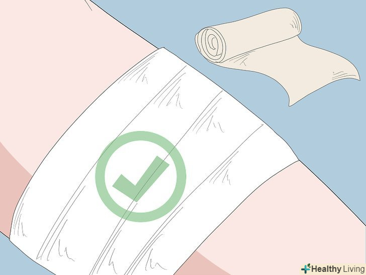 Притисніть до рани чистий бинт або пов'язку, щоб зупинити кровотечу.якщо рана продовжує кровоточити після того, як ви промили її, прикладіть до неї невеликий тиск. Притисніть до рани бинт або пов'язку і тримайте, поки не зупиніть кровотечу. Обережно витріть кров навколо пошкодженого місця.[3]- Якщо у вас немає стерильного бинта, використовуйте чистий паперовий рушник.