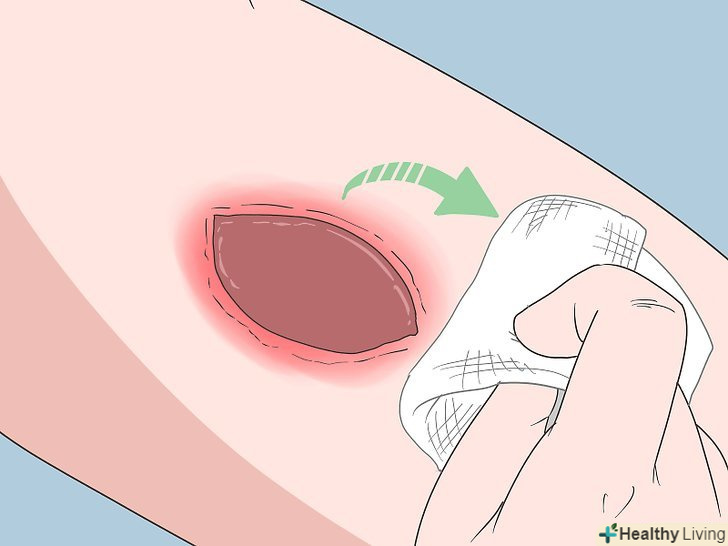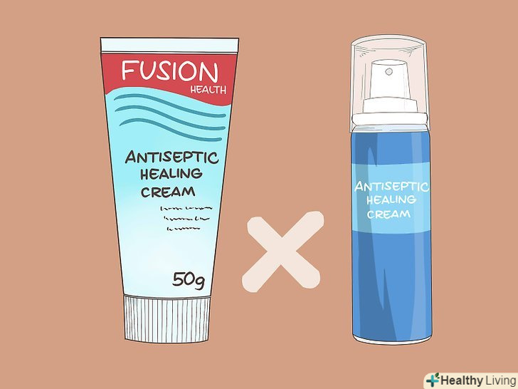 Не наносьте на рану антисептичні креми або спреї.з часом вони можуть пошкодити шкіру навколо рани, що сповільнить її загоєння. Замість цього промивайте рану водою з милом або, за рекомендацією лікаря, фізіологічним розчином.[20]