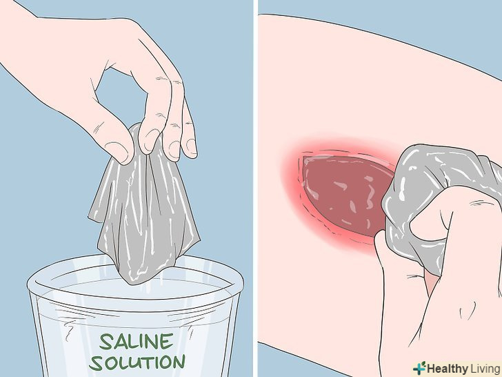Промийте рану фізіологічним розчином.просочіть фізіологічним розчином шматок чистого бинта і спочатку промокніть їм центр рани. Продовжуйте рухатися концентричними колами від рани. Витріть всі виділення, які можливо прибрати. Якщо бинт просочиться виділеннями, візьміть свіжий шматок і змочіть його фізіологічним розчином. Після того як ви очистите рану і шкіру навколо неї, візьміть чистий бинт, змочіть фізіологічним розчином і пройдіться ще раз.[14]- Якщо у вас немає фізіологічного розчину, промийте рану водопровідною водою. Це не повинно збільшити ризик інфекції.
