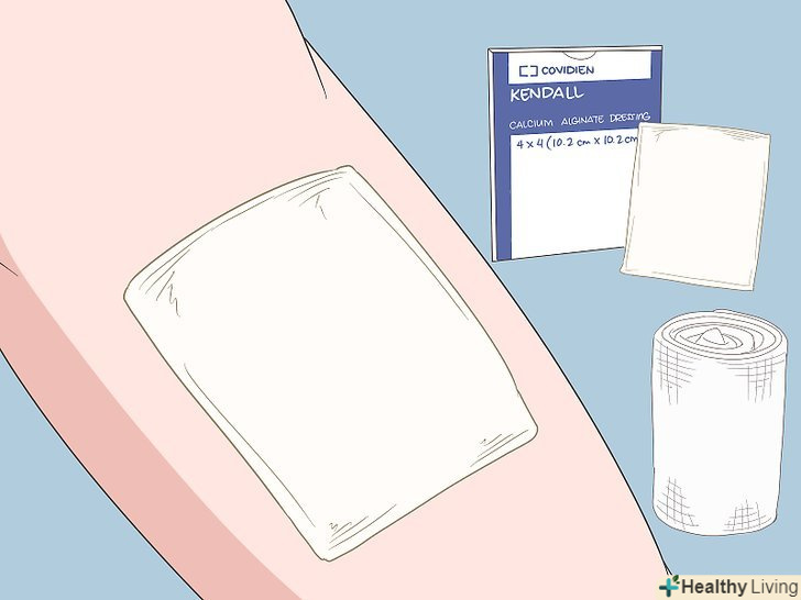Виберіть відповідну для рани пов'язку.наприклад, можна використовувати пов'язку, що складається з волокон кальцію-альгінату.[15] цей сучасний матеріал добре вбирає рідину і не робить жорсткої дії на рану. Також можна використовувати пов'язку з нетканого матеріалу, виготовленого за технологією Гідрофібер.[16] обидва цих матеріалу добре вбирають виділення. Обговоріть дане питання з лікарем.[17]- У деяких випадках лікар може накласти захист на шкіру навколо рани. Це може бути клейка стрічка або рідина, якою змащують шкіру. Даний шар захистить шкіру від рідких виділень з рани.[18]