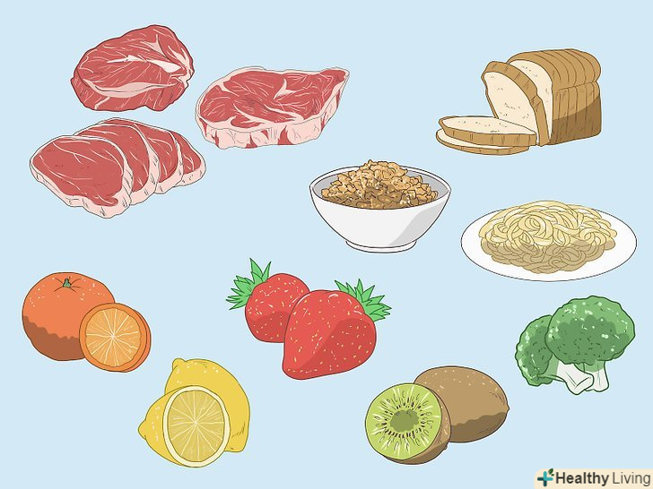 Слідкуйте, щоб ваш раціон був збалансований і містив білки, фрукти, овочі та продукти з цільних зерен.якщо рана заживає повільно, можливо, вам не вистачає поживних речовин. Включіть в свій щоденний раціон різні фрукти і овочі, а також кілька порцій нежирної білкової їжі, до якої відносяться курятина, риба, квасоля, тофу.[21]- Намагайтеся з'їдати 3-4 порції білкової їжі в день. Одна порція м'яса за розмірами приблизно відповідає колоді гральних карт.[22]