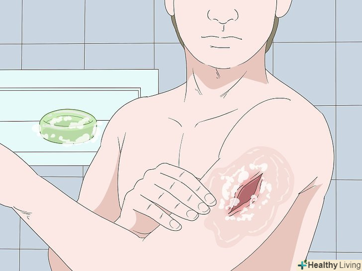 Вимийте пошкоджене місце водою з милом.підставте рану під проточну воду і обережно намильте її антибактеріальним милом, якщо воно у вас є. Якщо у вас немає такого мила, підійде будь-яке м'яке мило для рук або тіла. Обполосніть рану і постарайтеся змити якомога більше бруду і сміття.[2]- У разі опіку тримайте пошкоджене місце під прохолодною проточною водою протягом 5-10 хвилин.