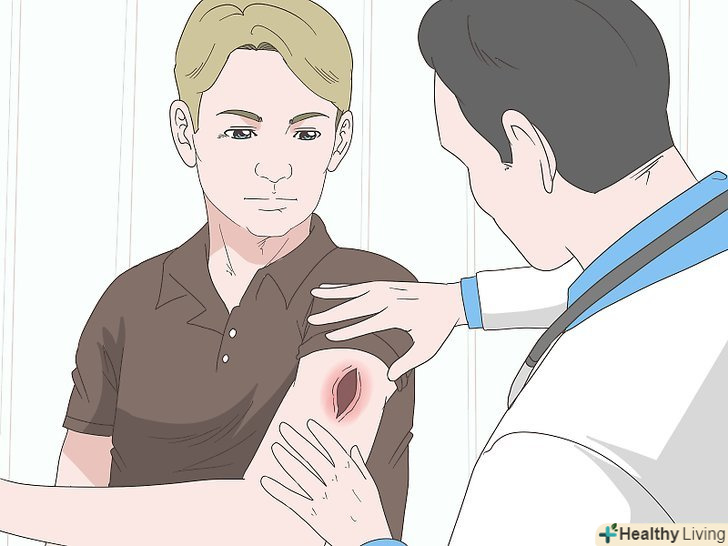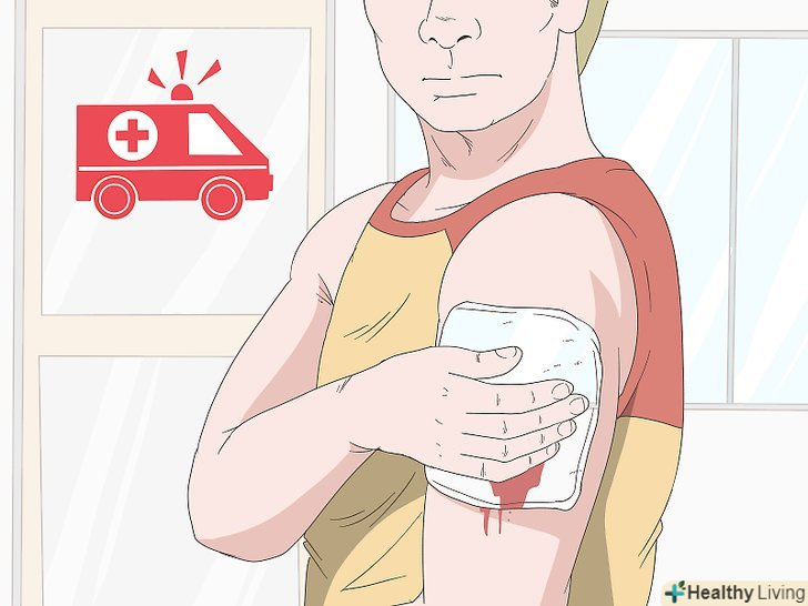 При серйозних ранах негайно зверніться в пункт невідкладної медичної допомоги.якщо ви отримали велику рану, з якої не перестаючи ллється кров, або проткнули шкіру глибше, ніж на півтора сантиметра, або отримали сильний опік (з пошкодженням великої ділянки шкіри і утворенням пухирів), необхідно звернутися в пункт швидкої медичної допомоги. Невідкладна медична допомога може знадобитися і в разі менш серйозної рани з невеликою кровотечею.[1]- У разі колючої рани негайно зверніться за медичною допомогою, якщо це укус (тварини або людини), особливо глибокий, якщо рана нанесена металевим предметом або не припиняє кровоточити після застосування тиску. Також слід звернутися до лікаря, якщо рана забруднена або розташована на суглобі, голові, шиї, тулубі або мошонці.