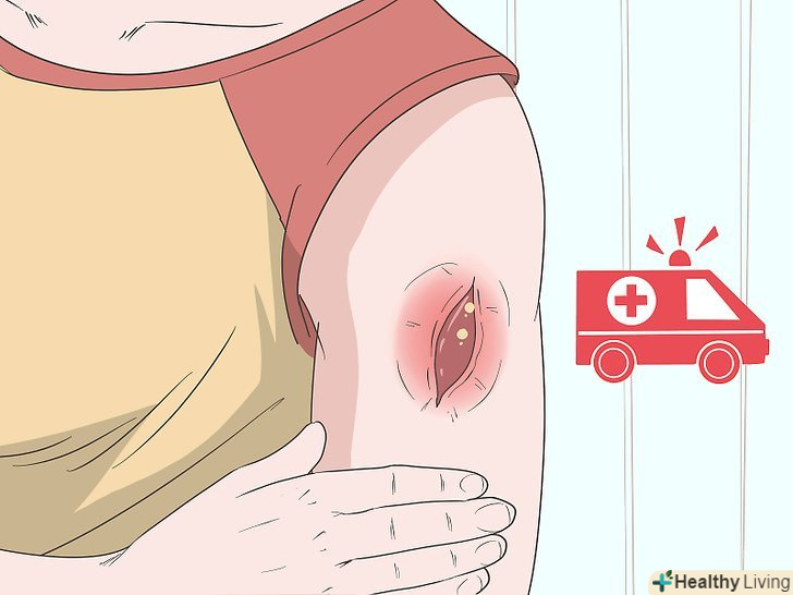 Відвідайте лікаря або Пункт невідкладної медичної допомоги, якщо рана інфікована.Слідкуйте за ознаками інфекції навіть в тому випадку, якщо ви вже відвідували лікаря. Почервоніння, набряк, відчуття тепла навколо рани, гнійні виділення свідчать про інфекцію. У разі подібних симптомів якомога швидше відвідайте лікаря.[5]- Негайно зверніться за медичною допомогою, якщо незабаром після отримання рани у вас піднялася температура і почався озноб. Тривожними ознаками є також нудота і блювота. Ці симптоми свідчать про те, що ваш організм намагається боротися з проникла через рану інфекцією.[6]