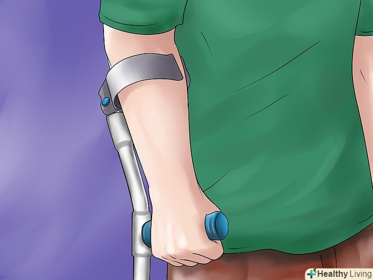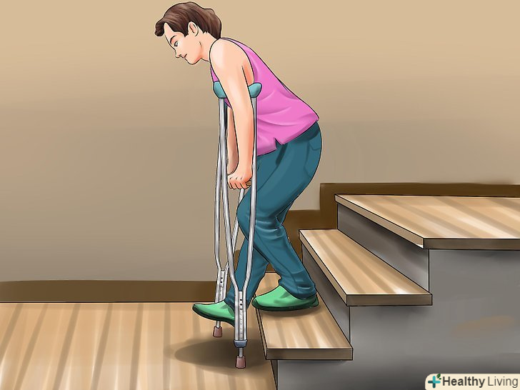 Навчіться підніматися і спускатися по сходах. Використовуйте поручень. Милицю несіть під пахвою, іншою рукою спирайтеся на поручень.- Піднімайтеся по сходах, чергуючи кроки, не забудьте милиці.