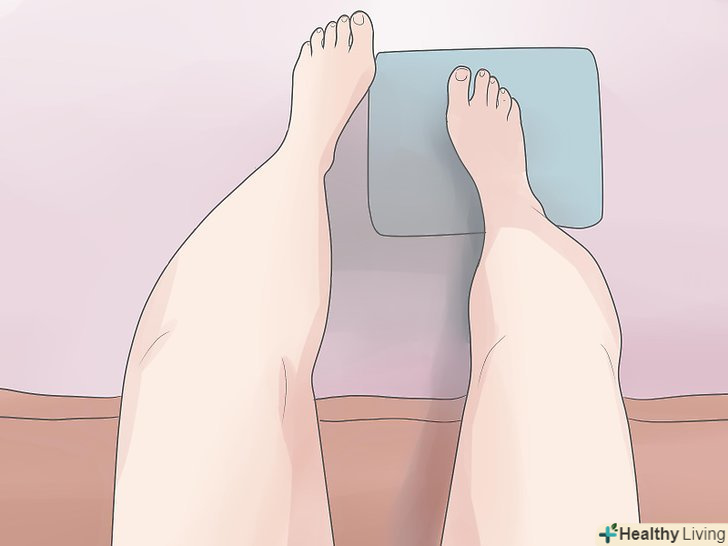 Притримуйте вашу ногу впіднятому положенні .підйом обмежує приплив крові до травмованої ділянки, тому набряк щиколотки трохи спаде. Ви можете підняти щиколотку, коли сидите або лежите.[4]- Сидяче положення: підніміть травмовану ногу так, щоб ступня перебувала вище ваших стегон.