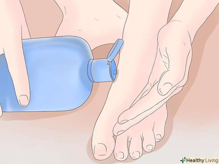 Промийте уражене місце.помийте ступню в прохолодній воді, щоб видалити осколки скла, які могли залишитися на поверхні шкіри, а також змити з шкіри будь-які забруднення. Використовуйте медичний спирт, перекис (пероксид) водню або розчин йоду, щоб обробити ділянку шкіри, де знаходиться скло. Змочіть дезінфікуючим засобом ватний диск і протріть область ступні, щоб продезінфікувати її.[4]