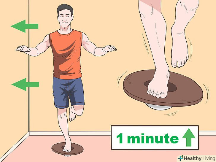 Постарайтеся поліпшити рівновагу тіла.часто розтягнення щиколотки погіршує рівновагу. Коли кісточка почне гоїтися, спробуйте виконувати вправи, які допоможуть відновити рівновагу і запобігти розтягнення та інші травми в подальшому.- Придбайте гойдаючу дошку або використовуйте тугу подушку. Виконуйте вправи біля стіни, щоб при втраті рівноваги спертися на неї, або попросіть кого-небудь підстраховувати вас. Для початку спробуйте утримувати рівновагу протягом однієї хвилини. Поступово збільшуйте цей час.[10]