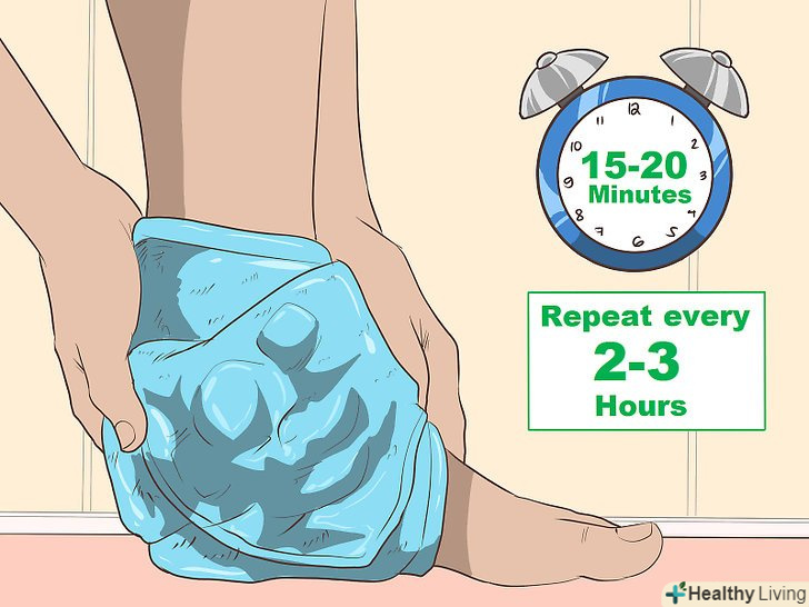 Прикладайте до щиколотки лід, щоб зняти набряк і зменшити біль.загорніть жменю льоду або пакет з льодом в кухонний рушник або іншу тонку тканину і прикладіть до пошкодженої щиколотки на 15-20 хвилин. Прикладайте холодний компрес раз в 2-3 години, поки не спаде набряк.[4]- Прикладайте до щиколотки крижані компреси навіть в тому випадку, якщо ви збираєтеся відвідати лікаря. Холод допомагає зняти запалення.