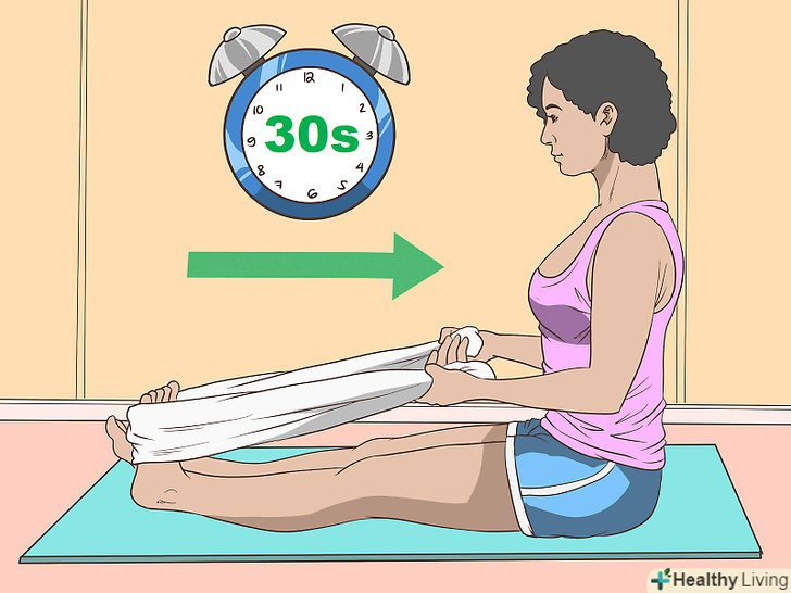 Обережно виконуйте розтягуючі вправи, щоб підвищити гнучкість щиколотки.розтягнення щиколотки часто супроводжується напругою литкових м'язів. Слід розтягувати ці м'язи, щоб відновити їх нормальний обсяг рухів, інакше можливі подальші травми. Як і в разі зміцнюють вправ, необхідно попередньо проконсультуватися з лікарем, який визначить, чи можна вам виконувати розтяжки.[9]- Сядьте на підлогу і витягніть ноги перед собою. Оберніть рушник навколо підйому склепіння стопи. Потім потягніть за рушник, утримуючи ногу прямо. Спробуйте виконувати розтяжку протягом 15-30 секунд. Якщо ця вправа викликає сильний біль, почніть з пари секунд і поступово збільшуйте час. Виконуйте розтяжку від 2 до 4 разів на день.