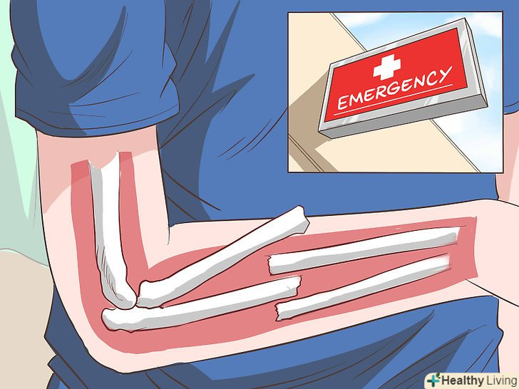 Якщо з рани проглядає кістка, негайно зверніться за медичною допомогою.коли зламана кістка проколює шкіру або рана така, що видно зламана кістка, то такий перелом називається відкритим або складним. Ці види переломів виключно болючі, небезпечні і важкі для лікування. Найчастіше види травм, які викликають складні переломи, також можуть стати причиною інших серйозних пошкоджень.[13] щоб переконатися в тому, що пацієнт отримує швидке, ефективне лікування, його необхідно негайно доставити в лікарню.- За винятком особливих випадків, як правило, рекомендується не намагатися виправити складні переломи без допомоги кваліфікованого медичного працівника.