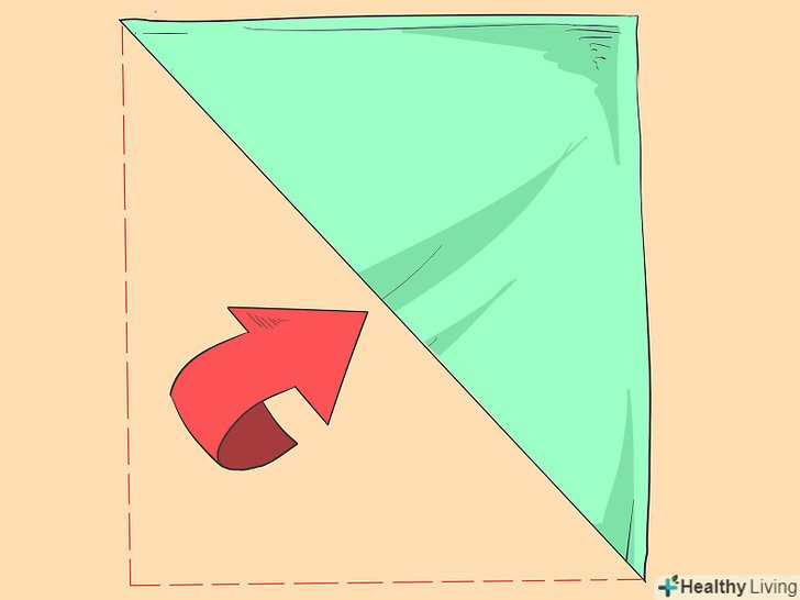 Складіть тканину навпіл по діагоналі, щоб зробити трикутник.потім вам знадобиться скласти відріз тканини по діагоналі так, щоб вийшов трикутник. Коли вона буде носитися як перев'язь, то «широка» сторона трикутника стане підтримувати вашу руку, а сторони вузькі сформують зручний комір за вашою головою.[2]- Якщо з якихось причин ви знаходите, що перев'язка незручна, коли тканина складена, то ви можете обрізати квадрат по діагоналі, щоб створити ту ж саму форму.