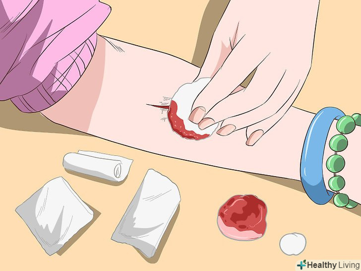 - Перев'яжіть рану. Використовуйте таку пов'язку, яка дозволить закрити рану повністю, без клейкого матеріалу, який би стосувався самої рани. Якщо необхідно, покладіть чисту марлю між пов'язкою і раною.