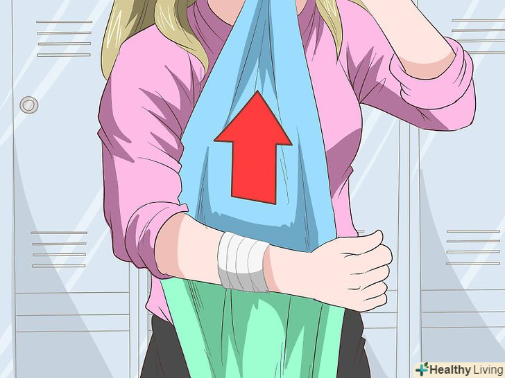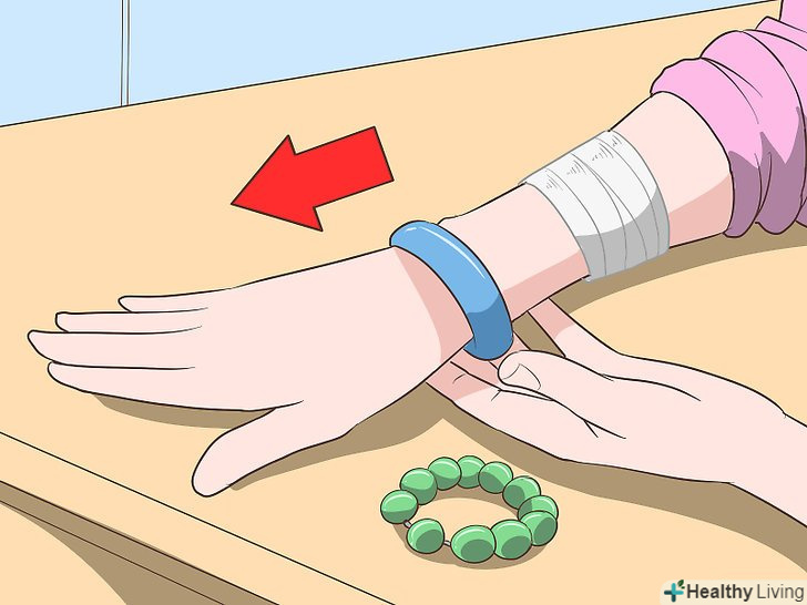 Зніміть всі прикраси з травмованої руки. Вам потрібно зняти всі кільця, браслети, і / або нарукавні пов'язки, які ви носите на травмованій руці. Якщо травмована рука набрякає в міру загоєння, то прикраси (особливо ті, що щільно облягають) можуть стати причиною недостатнього припливу крові до руки, що може викликати біль, роздратування і навіть закупорку судин.[4]