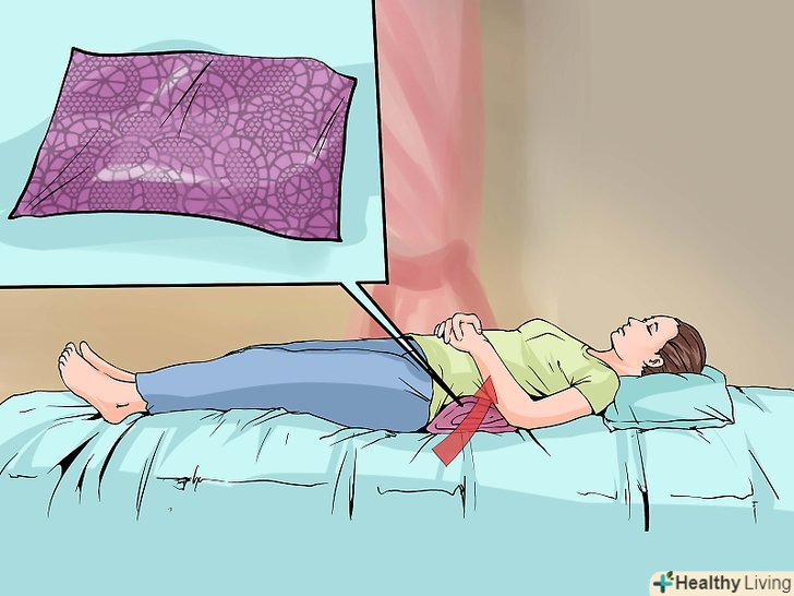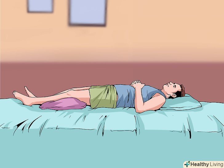 Зіпріться на подушку або ковдру.хоча краще положення-лежачи на боці з зігнутими ногами і подушкою для опори, можна трохи видозмінити це положення, якщо ви відчуваєте посилення болю. Просто візьміть подушку і покладіть її під поперек, а потім, залишаючись на боці, відкиньтеся на подушку. Це послабить тиск на стегна. [3]- Такий стан особливо стане в нагоді вагітним жінкам, у яких болі в стегні зазвичай розвиваються в третьому триместрі, коли сполучна тканина послаблюється і розтягується в підготовці до пологів. Ще їм можна використовувати подушку, щоб створити опору для живота.