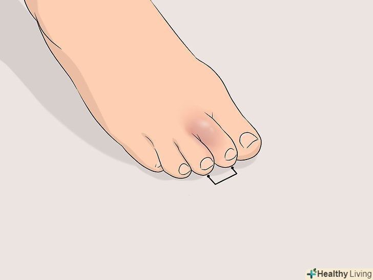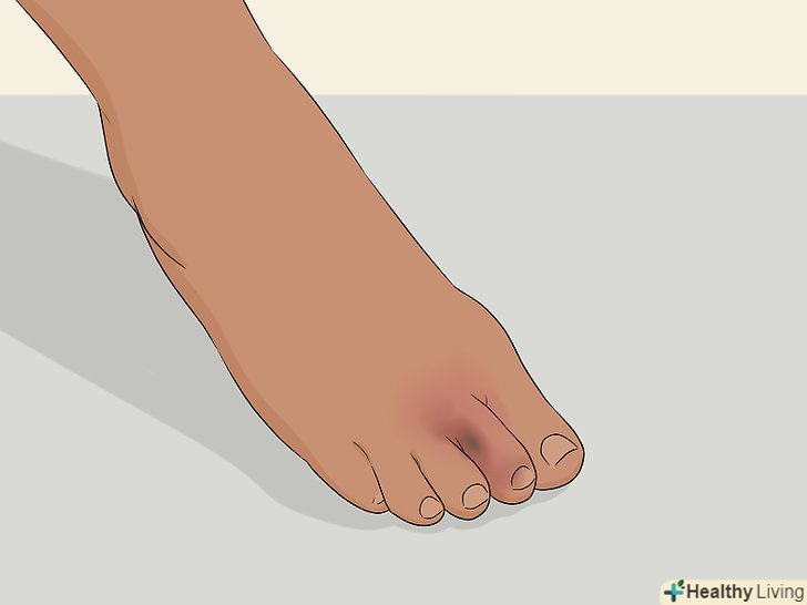 Визначте, який палець травмований.пальці ніг схильні до травм, їх можна пошкодити навіть в тому випадку, якщо спіткнутися об меблі або стукнутися об спортивний інвентар. Як правило, відразу зрозуміло, який палець травмований, хоча іноді необхідно уважно оглянути стопу, щоб краще з'ясувати, що сталося. Для легких і помірних травм характерні такі ознаки, як почервоніння, набряк, запалення, локальна біль, синець, знижена рухливість, а іноді і невелика викривленість пальця, якщо він вивихнуть або зламаний. Травми і переломи частіше трапляються з мізинцем і великим пальцем, ніж з іншими пальцями ніг.[2]- Бинтування травмованого пальця разом з сусіднім підходить при більшості травм пальців ніг, навіть в разі стресових або втомних переломів, хоча при більш серйозних переломах може знадобитися накладення гіпсу або операція.[3]