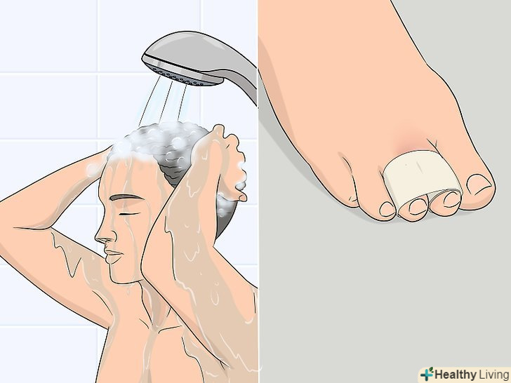 Міняйте пов'язку після миття.якщо первинну пов'язку наклав лікар, він, ймовірно, використовував водостійкий бинт, щоб ви могли хоча б раз прийняти душ або ванну. Однак після цього будьте готові до того, щоб міняти пов'язку після кожного купання і перевіряти при цьому, чи немає ознак подразнення шкіри або інфекції.[7] садна, пухирі і мозолі збільшують ймовірність шкірної інфекції, тому ретельно мийте і сушіть пальці перед тим, як повторно накласти пов'язку. Можна також протирати пальці змоченими спиртом серветками, щоб дезінфікувати їх.- До ознак шкірної інфекції відносяться локальний набряк, почервоніння, пульсуючий біль, гнійні виділення.