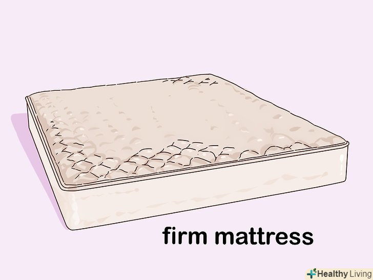 Спіть на жорсткому матраці, щоб він підтримував ваш хребет.матрац середньої жорсткості дозволить хребту приймати нейтральне положення під час сну. У випадку з грижею міжхребцевого диска, можливо, ви вирішите утриматися від дуже жорстких матраців. Дуже жорсткий матрац може виявитися занадто твердим і викликати додаткове навантаження на хребет.[6]- Утримайтеся від використання матраців з м'яким верхом і такими матеріалами в основі, як піна з ефектом пам'яті, яка зазвичай буває занадто м'якою для тих, хто страждає грижею міжхребцевого диска.