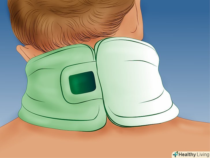 Корсет для шиї.при травмі шиї, її слід чимось підтримувати. Для цього підійде м'який, регульований корсет для шиї. Однак, не завадить проконсультуватися з лікарем щодо часу, протягом якого слід його носити. Такий корсет не потрібно носити постійно, так можуть ослабнути м'язи шиї. Корсет для шиї також можна придбати в аптеці. [3] виберіть корсет, який підійде вашій шиї:- Виміряйте довжину шиї від ключиці до основи підборіддя. Якщо вам боляче це робити самому, попросіть кого-небудь допомогти.