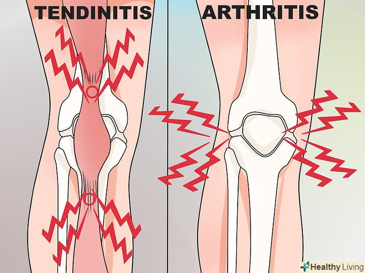 Розрізняйте біль, спричинену тендинітом та іншими ушкодженнями та травмами.тендиніт нерідко виникає в місцях, які зазнали інші пошкодження, наприклад, в коліні або лікті. Знання того, як можна розпізнати біль, обумовлену тендинітом, дозволить вам більш ефективно визначати це захворювання і боротися з ним.[16]