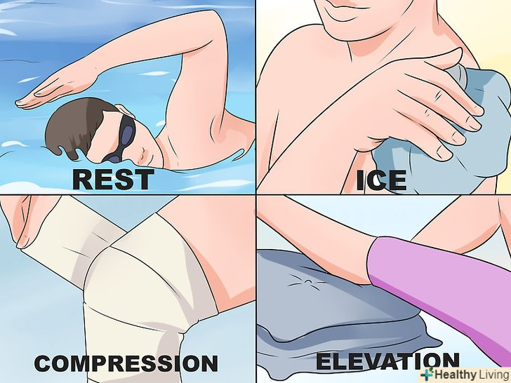Скористайтеся принципом "RICE".якщо у вас стався напад тендиніту, або ви вважаєте, що хвороба може повторитися, перед візитом до лікаря можна спробувати домашні засоби. Ви можете пом'якшити симптоми захворювання і запобігти його повторення, використовуючи принцип "RICE", що є англійською абревіатурою для "спокій, лід, компресія, підняття".[19]- Майте на увазі, що навіть при ранньому виявленні та лікуванні тендиніт може тривати більше трьох місяців. Якщо ви кілька місяців відкладали візит до лікаря, лікування триватиме ще довше.[20]