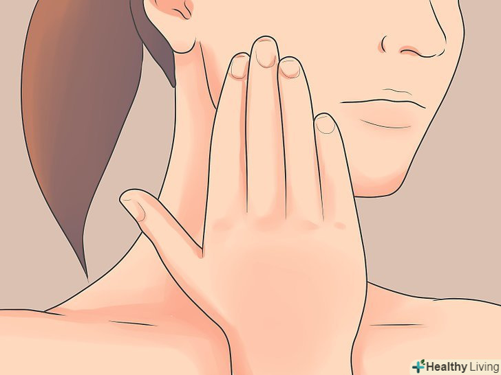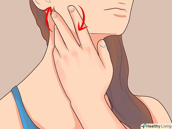Помасажуйте щелепу, щоб зняти напругу з м'язів.Зробіть собі легкий масаж кінчиками пальців, щоб розслабити м'язи щелепи і зняти м'язову напругу. Кінчиками двох пальців сильно натисніть на щелепу. Перпендикулярними і невеликими розмашистими рухами проведіть кінчиками пальців по щелепі.[7]- Спочатку виконайте цей легкий масаж протягом однієї-двох хвилин, після чого помасажуйте обидві сторони щелепи по три-чотири хвилини.