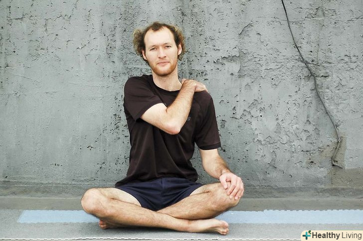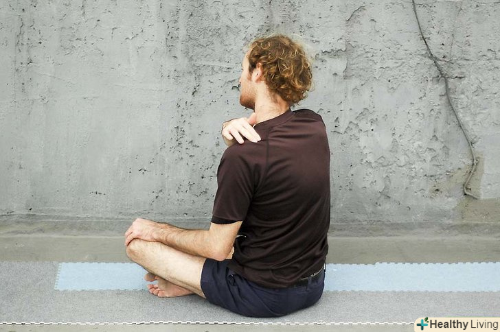 Поверніть корпус вліво до тих пір, поки не відчуєте натяг в м'язах правої грудей.потримайте так 15-30 секунд, потім послабте натяг.