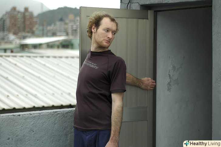 Повторіть вправу для розтяжки плеча на вашій лівій стороні, використовуючи зворотну частину дверей.якщо ваші плечові м'язи були дуже напружені, повторіть цю вправу ще кілька разів для кожного плеча.