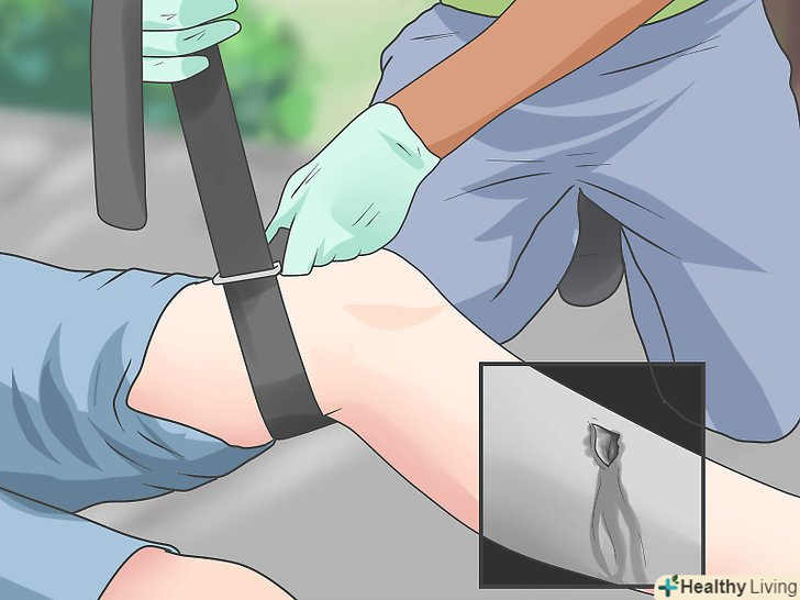 Контролюйте можливу кровотечу.перш ніж зайнятися переломом, подбайте про відкриті рани.[12] якщо зламана кістка виступає з-під шкіри, не торкайтеся до неї і не намагайтеся засунути всередину. Зазвичай кістки мають сірий або світло-бежевий, а не білий колір, як у фільмах жахів і демонстраційних скелетах.- У разі сильної кровотечі спочатку зупиніть його, і лише потім займіться переломом.