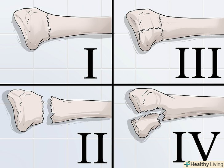 Оцініть серйозність травми.переломи оцінюють за ступенем зміщення фрагментів кістки і тому, зачеплений чи суглоб. При цьому враховують, скільки фрагментів кістки змістилося зі свого початкового положення. Для цього використовують відповідну шкалу. Іншим важливим фактором при оцінці тяжкості перелому є те, чи зачіпає він суглоб, тобто є «суглобовим», на відміну від позасуглобового перелому. Як правило, суглобові переломи серйозніше і їх лікування складніше.- Є кілька типів переломів променевої кістки в залежності від їх тяжкості. Розрізняють такі види: тип I — позасуглобовий перелом без зміщення фрагментів кістки; тип II — позасуглобовий перелом зі зміщенням кістки; тип III — суглобовий перелом без зміщення фрагментів кістки; тип IV — суглобовий перелом зі зміщенням кістки.[7]