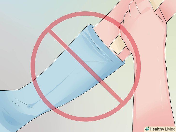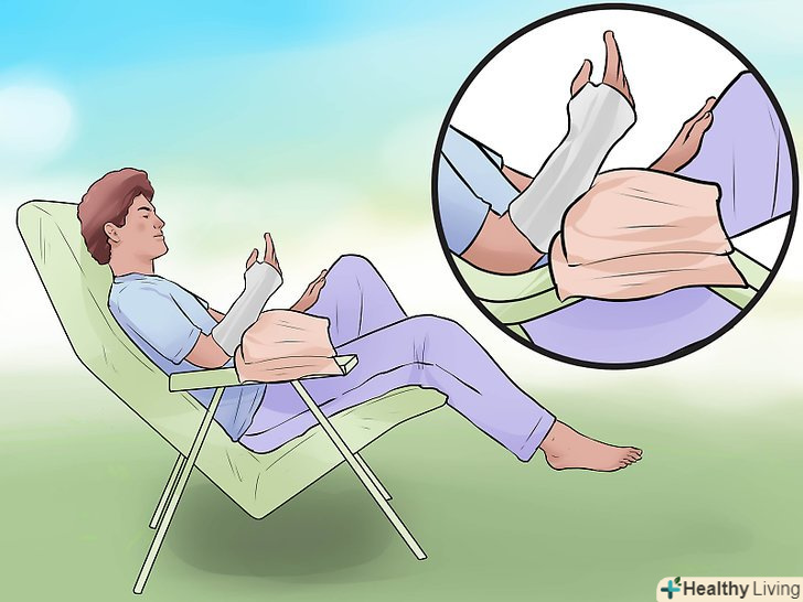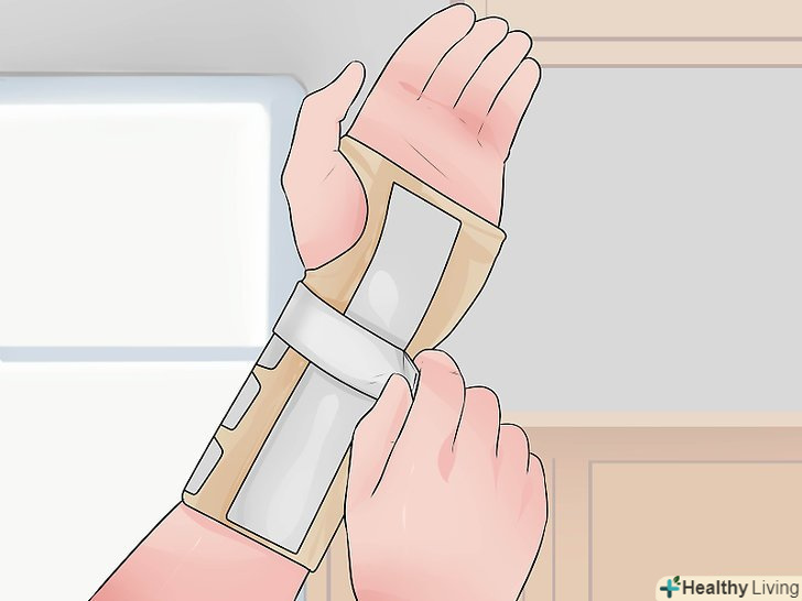 Підніміть зап'ястя і тримайте його нерухомо.тримайте зап'ястя в піднятому і нерухомому стані не менше одного тижня після того, як вам накладуть пов'язку. Підняте положення означає, що зап'ясті повинно знаходитися вище рівня серця. Утримуйтеся від інтенсивних вправ і занять, при яких необхідно використовувати зап'ясті.[13]- Можна підкладати під зап'ястя подушки, коли ви сидите в кріслі. Найкраще підійде крісло з відкидною спинкою, хоча можна використовувати і звичайне крісло або софу.