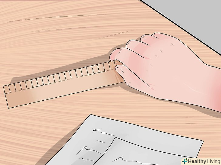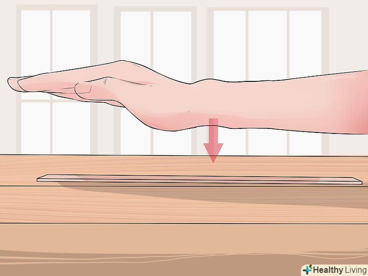 Знайдіть шину, за допомогою якої можна зафіксувати зап'ясті.пошукайте що-небудь, що допоможе знерухомити зап'ясті. По довжині шина повинна відповідати передпліччя, зап'ястя і долоні. Якщо у вас немає відповідної стандартної шини вдома (або там, де ви отримали травму), можна використовувати будь-який широкий і плоский предмет відповідної довжини.[2]- Наприклад, якщо у вас є лінійка такої довжини, як долоню, зап'ястя і передпліччя, використовуйте її в якості шини.