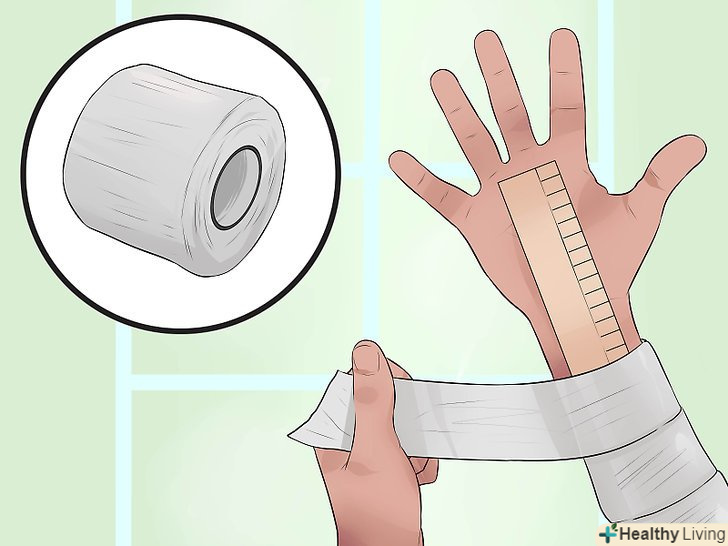 Накладіть на шину і зап'ясті пов'язку.Обмотайте нижню частину руки і зап'ястя простим або еластичним бинтом. Досить туго накладіть пов'язку, щоб вона не зрушувалася. У той же час не слід накладати її занадто туго, інакше вона утруднить кровообіг в долоні.[4]- Якщо у вас немає під рукою простого або еластичного бинта, можна прикріпити зап'ясті до шини за допомогою шарфа або бандани.