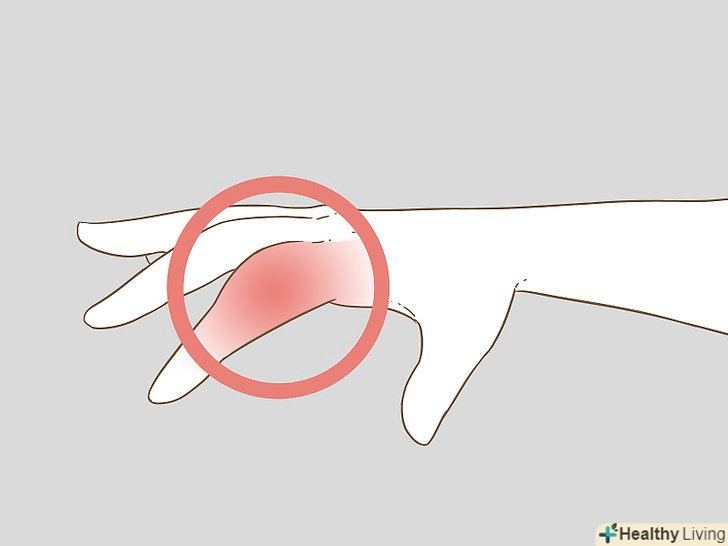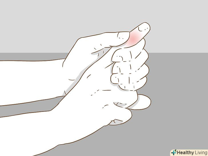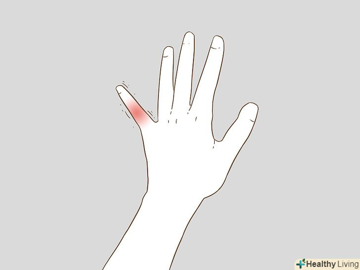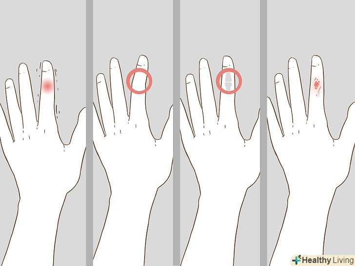 Зверніть увагу на припухлість і синець.перелом пальця супроводжується гострим болем, після чого виникає набряк або синяк. Це є природною реакцією організму на отримане пошкодження. Після перелому в організмі включається запальний процес, який призводить до набряку в результаті виділення рідини в навколишні тканини.[2]- Часто слідом за набряком утворюється синець. Це відбувається в результаті того, що навколишні перелом дрібні кровоносні судини розбухають або лопаються через підвищеного тиску рідини.[3]