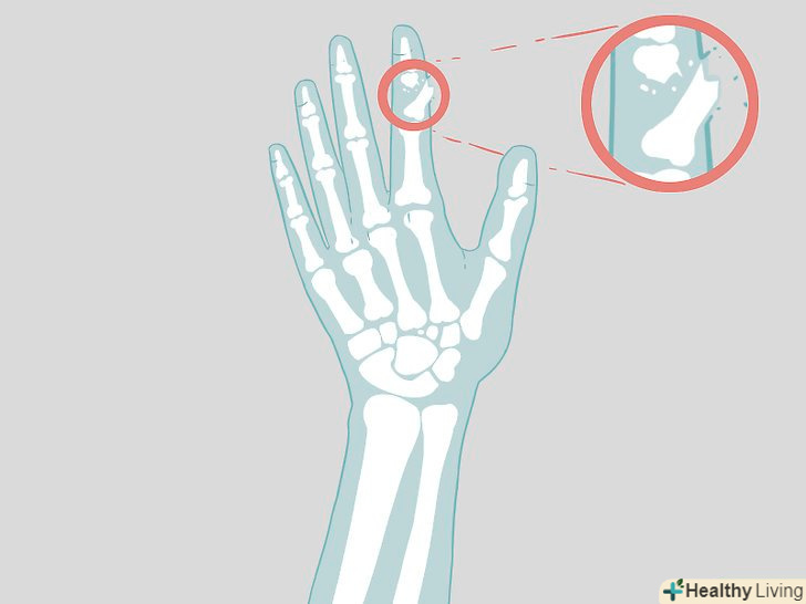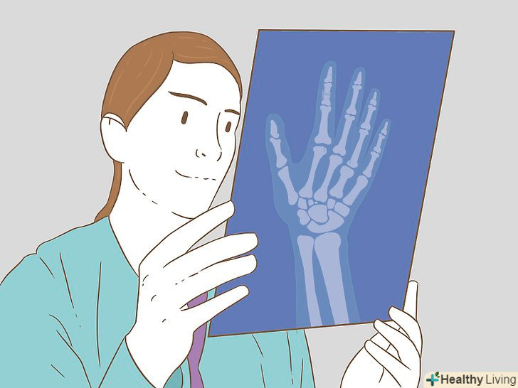 Пройдіть зовнішній огляд.якщо ви підозрюєте що у вас зламаний палець, зверніться за медичною допомогою. При зовнішньому огляді лікар оцінить травму і визначить тяжкість перелому.[7]- Лікар попросить вас зігнути кисть в кулак і оцінить діапазон рухів. Він також зверне увагу на зовнішні ознаки, такі як набряк, синець і деформація кістки.