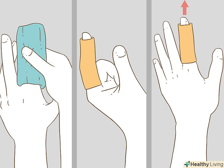 Прикладайте лід, накладайте тугу пов'язку і піднімайте пошкоджене місце.знижуйте набряк і біль за допомогою льоду, стискає пов'язки і підняття пальця. Чим швидше після травми ви застосуєте ці методи першої допомоги, тим краще. Не забудьте також зафіксувати пошкоджений палець.[12]- Прикладайте до пальця лід. Обмотайте тонким рушником пакет із замороженими овочами або льодом і обережно прикладіть його до пальця, щоб знизити набряк і біль. Прикладайте крижаний компрес відразу після травми не довше ніж на 20 хвилин за один раз.