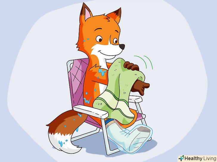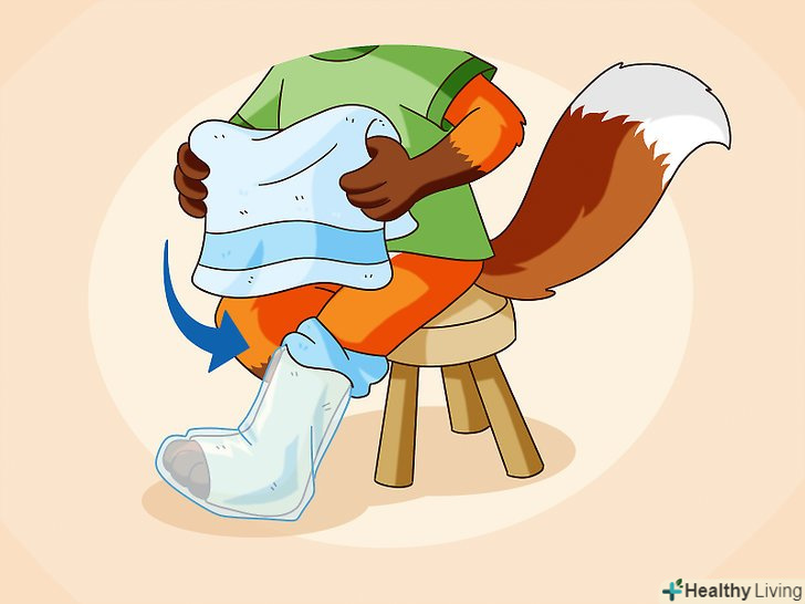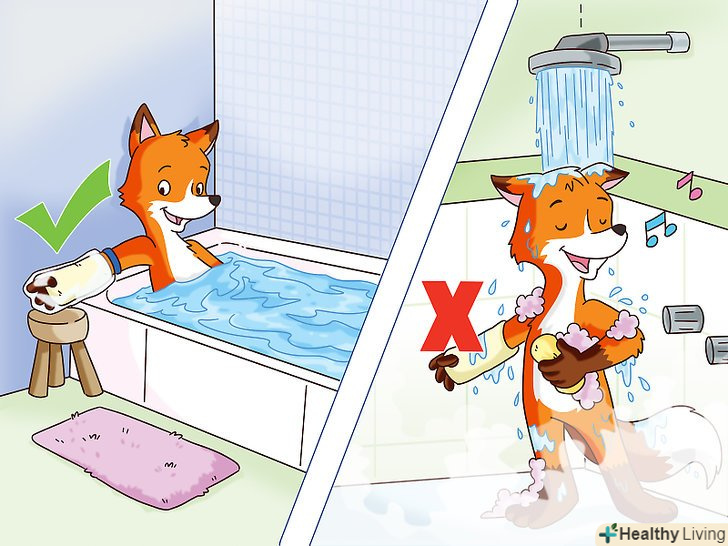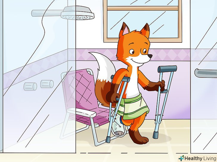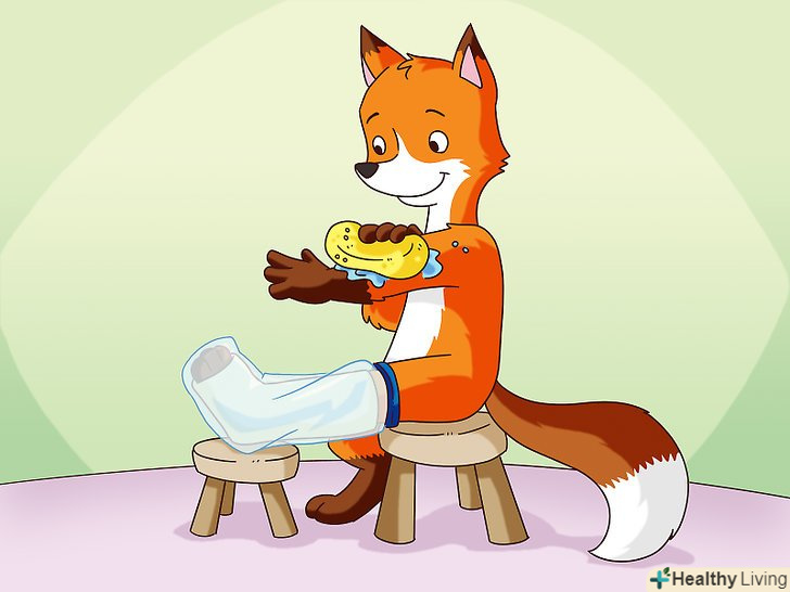 Спробуйте замість душу обтиратися мокрою губкою.крім ризику замочити гіпс, після травми важко заходити в душ і виходити з нього. Це особливо складно в тому випадку, якщо у вас зламана нога. По можливості намагайтеся не приймати душ, а обтиратися мокрою мочалкою.[7]- У разі гіпсової пов'язки у дитини, можливо, варто обтирати його мокрою губкою до тих пір, поки він не освоїться з пов'язкою або її не знімуть.