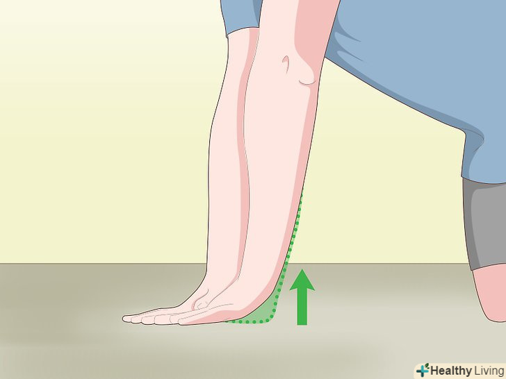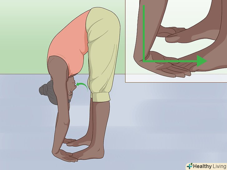 Спробуйте встати в позу горили.це одне з вправ йоги, яке призначене для розтягування і зміцнення зап'ясть. Суть вправи в тому, щоб зробити максимальний нахил тулуба і розташувати руки на підлозі долонями вгору, підсунувши їх під шкарпетки стопи.[12]- Розставте ноги на ширині плечей. Нахиліть корпус, трохи зігніть ноги в колінах і покладіть руки на підлогу.